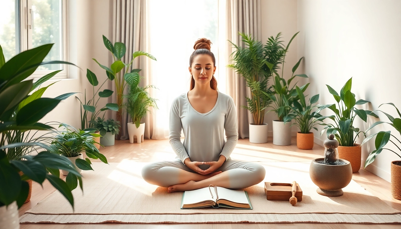 Engage with mental health tips in a serene meditation setting that encourages relaxation and mindfulness.