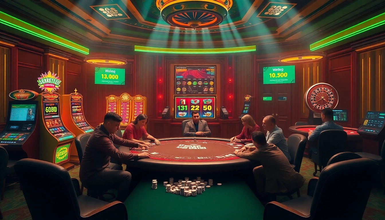 Experience U888 with an electrifying casino scene featuring poker, slots, and roulette.