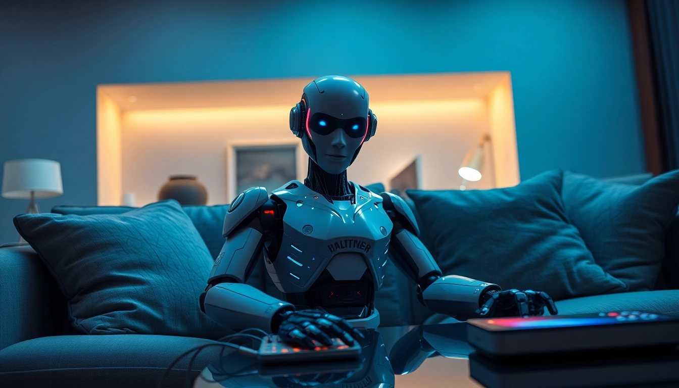 A lifelike sex bot featured in a modern living room, showcasing advanced AI technology and intimate ambiance.
